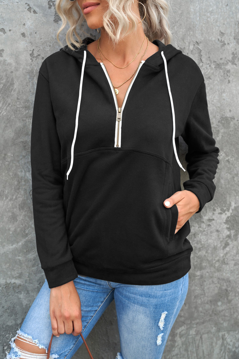 Black Half Zip Long Sleeve Hoodie with Pocket